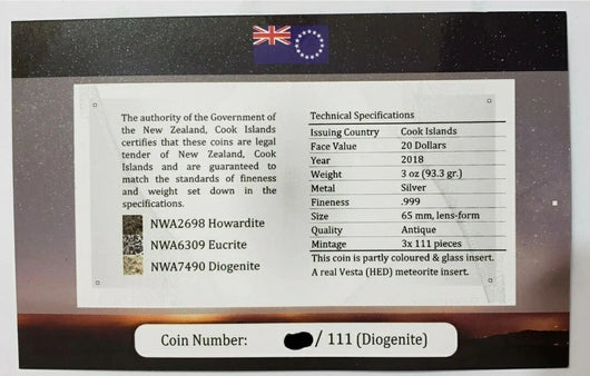 2018 Cook Islands $20 VESTA METEORITE 3 Oz Silver Coin