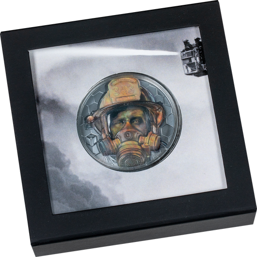 This is the second release in our “Real Heroes” series that follows the immensely popular “Pilot” coins. This time, we focus on the Firefighter. Nobody will forget the heroism of the Firefighter facing unimaginable circumstances during the 9/11 attacks. Images of courage and bravery seared into our consciousness forever. More recently, we have seen many images of these heroes in action fighting the wildfires of the world. CIT is proud to honor this “Real Hero” by presenting the most stunning coin ever done of the Firefighter. A tribute to not only those who gave the ultimate sacrifice during 9/11, but to all Firefighters that we count on to keep us safe. This 3 oz Black Proof measures 50 mm in diameter and features a stunning, realistic image of a Firefighter from the New York City Fire Department. The number 343 on the helmet honors the Firefighters that were loss that day in the Twin Towers. Thanks to the enhanced smartminting® technology the ultra high relief, partly polished honeycomb pattern and extremely detailed elements reaching to and even over the edge of the coin generate an unbelievable design. The visor that protects his eyes from the dangerous smoke and gases is a unique overlay that makes this coin even more special. “ONLY THE BRAVE ARE FREE” and the illustration of the original twin towers on the obverse are a matching and worthy statement to honor these real heroes. A mintage of only 911 will be struck.