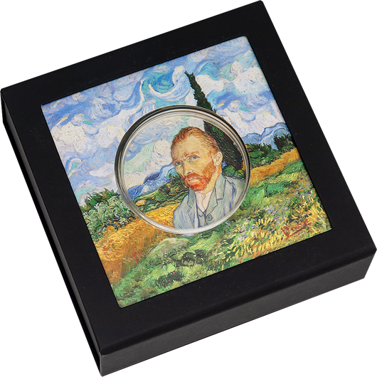 The idea of this new series is to combine a famous painting with a portrait of its artist. This edition is dedicated to Vincent van Gogh (1853–1890), considered one of the greatest painters of all time, a true Master of Art. His most creative and productive period began in February 1888, when the Dutch painter moved to Arles in the south of France, where he formed a working and living partnership with Paul Gauguin. During this time, he created many of his most famous works, especially landscape paintings, interiors and self-portraits. Among them ‘Wheat Field with Cypresses‘ which was selected for this coin. Van Gogh finished this painting, with its vibrant colours and striking brushstrokes, in 1889. Which was only about a year before his tragic, self-inflicted death. “I put my heart and my soul into my work, and have lost my mind in the process.” (Vincent van Gogh) The original painting with a height of 73 cm (28.7 in) and width of 93.4 cm (36.7 in) can be admired in full color at the Metropolitan Museum of Art in New York. The painting has resided there since 1993. On this ultra-high relief 2 oz proof, the artist himself poses in front of his masterpiece. Thanks to the enhanced smartminting® technology, this is done in a very realistic way. The obverse shows a painter working on his next masterpiece. The effigy is cleverly used as the painting he is working on. The mintage is limited to only 999 pieces. Be quick before the wheat has withered.