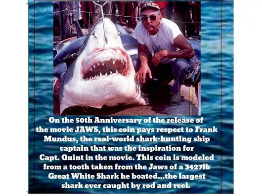 On the 50th anniversary of the release of the movie JAWS©, this coin pays respect to Frank Mundus; the real-world shark-hunting ship captain that was the inspiration for Capt. Quint in the movie. This coin is modeled from a tooth taken from the jaws of a 3427lb Great White Shark he boated..the largest shark ever caught by rod and reel.